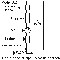 Using an in-line monitor such as a Model 682 colorimeter, expensive sampling and analysis can be avoided and alarm functions can be used to alert an operator of excessive levels of contaminant before discharge, avoiding potential penalties and fines from local authorities. A typical installation uses a Model AF21 or Model AF22 dual beam absorbance sensor in a sample stream with the transmitter housed locally in a NEMA 4 enclosure. A sample probe with a screen to reject large debris is used to extract the sample from a larger discharge pipe. A self-priming pump, capable of delivering about ½ liter of liquid per minute draws the sample through the loop. The strainer should be installed to keep larger particles from getting to the pump. After the pump, a 10 micron cartridge filter cleans the sample prior to entering the sensor. The 10 micron filter approximates a typical laboratory procedure and ensures correlation to lab samples is direct, making the calibration of the system easier. Flow should be vertically up through the sensor, ensuring the sample cell is filled at all times. Valves should be fitted to allow isolation of the loop for calibration and maintenance purposes.
